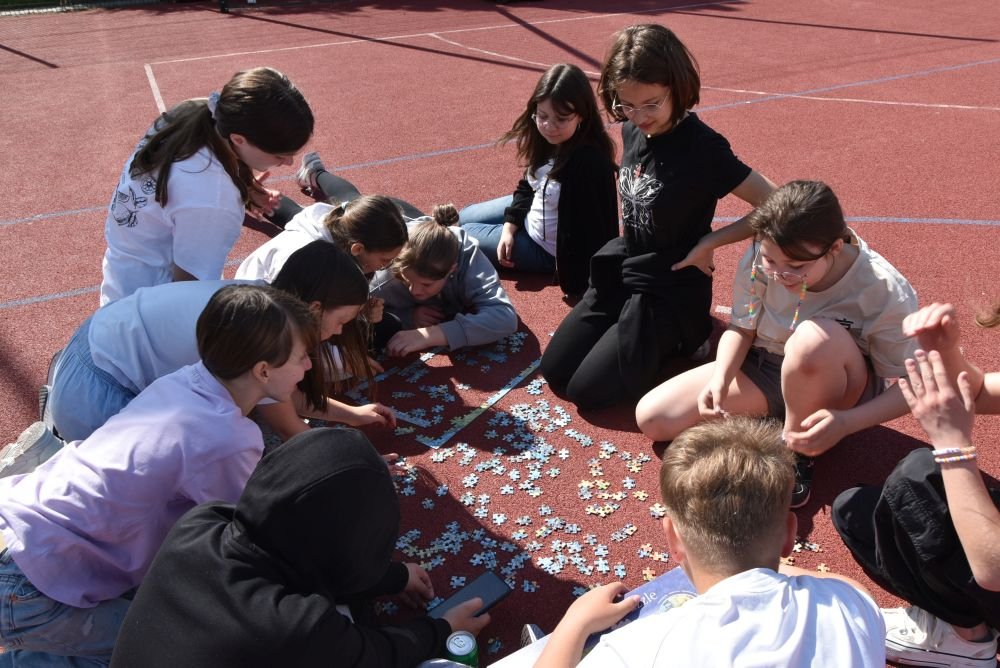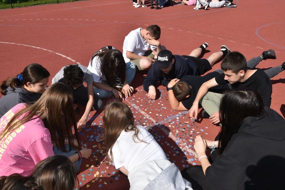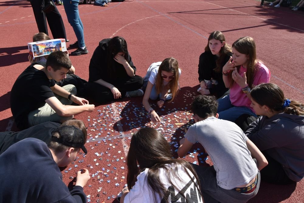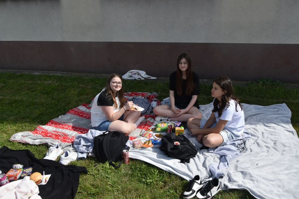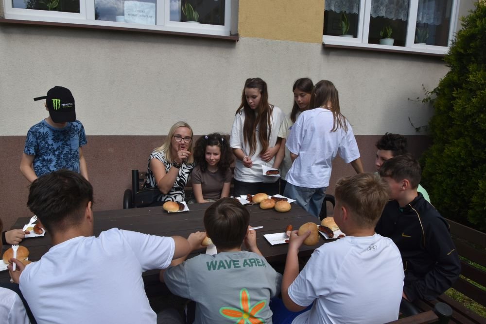 Również starsi uczniowie wykorzystali wspaniałą pogodę i spędzili czas na rywalizacji w układaniu puzzli. Na boisku każda klasa miała wydzielone miejsce i puzzle, które wylosowała. Była to lekcja zarządzania grupą, która okazała się wcale nie taka łatwa. Były dyplomy i słodycze. Na każde dziecko czekała dobrze wypieczona kiełbaska. Uczniowie przynieśli kocyki i biesiadowali na trawie. Była to wspaniała majówka. Jeszcze tylko na lody z opiekunami i .... szkoda, że ten dzień tak szybko minął.