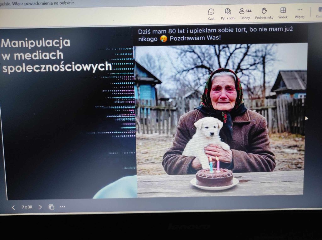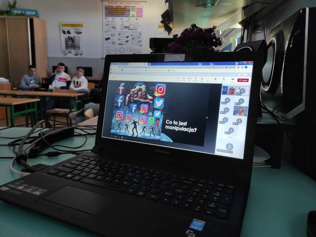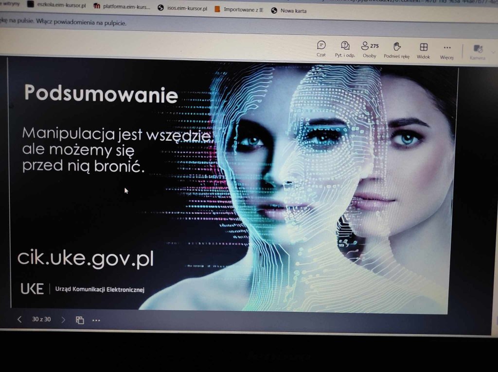 19 marca uczniowie klasy 7c uczestniczyli w webinarze zorganizowanym przez Urząd Komunikacji Elektronicznej pt.: „Manipulacja w mediach społecznościowych” . Podczas wydarzenia uczniowie poznali techniki krytycznej oceny treści publikowanych w Internecie oraz sposoby unikania łatwego ulegania manipulacjom.