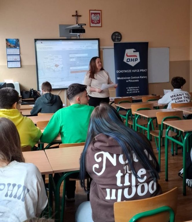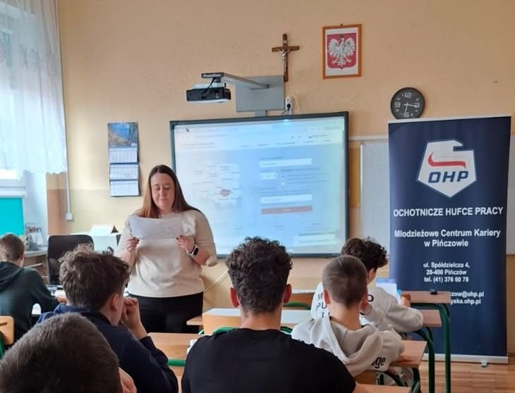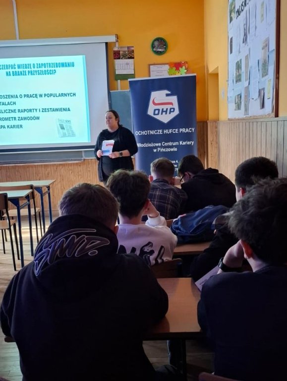Warsztaty wyboru zawodu dla uczniów klasy 7c "Branże i kompetencje przyszłości" prowadzone przez p. Monikę Mrozik doradcę zawodowego z MCiZ w Pińczowie